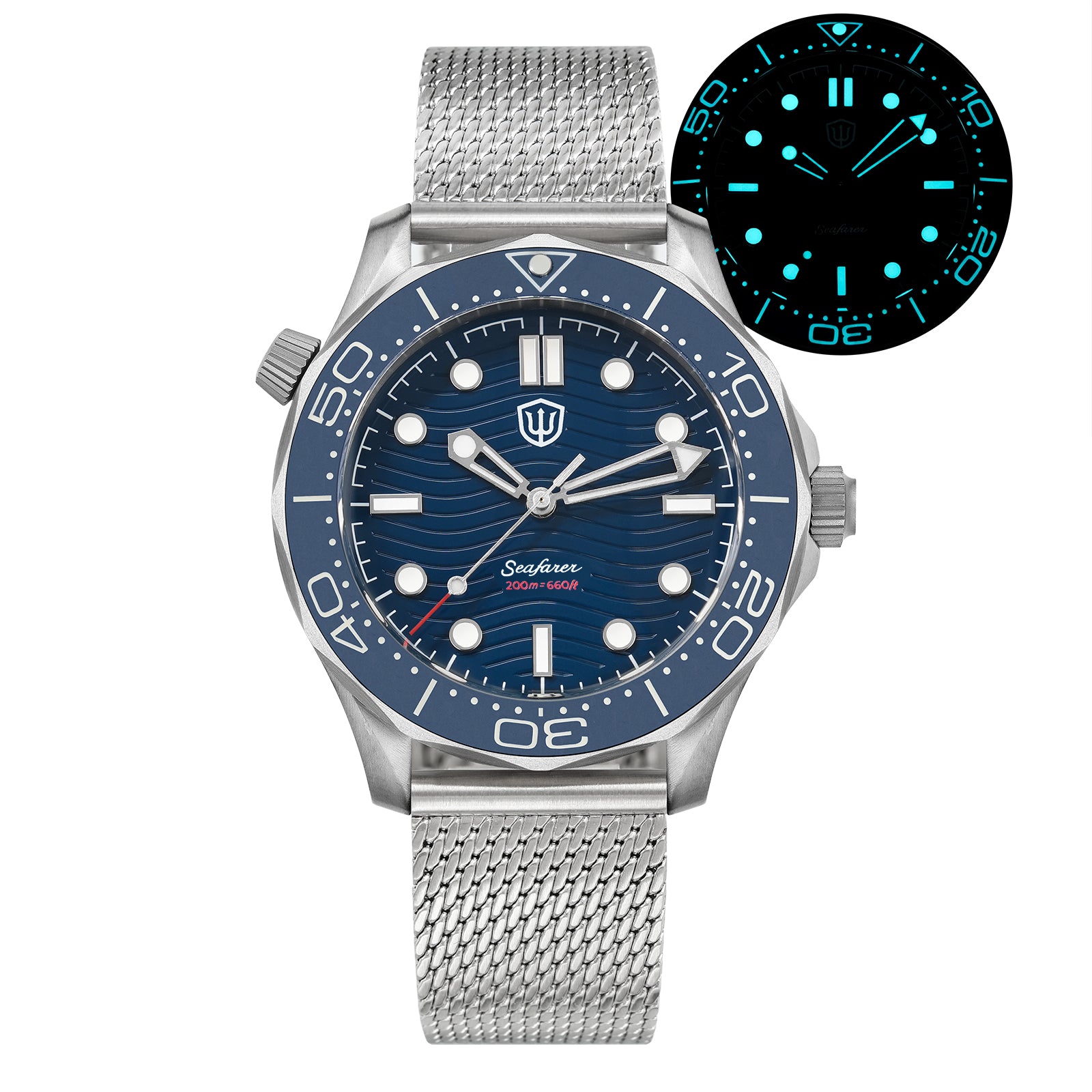 Luminous: Swiss Super Luminova C3 green for vintage black dial. Swiss BGW9 blue for white/blue/enamel wave dial.