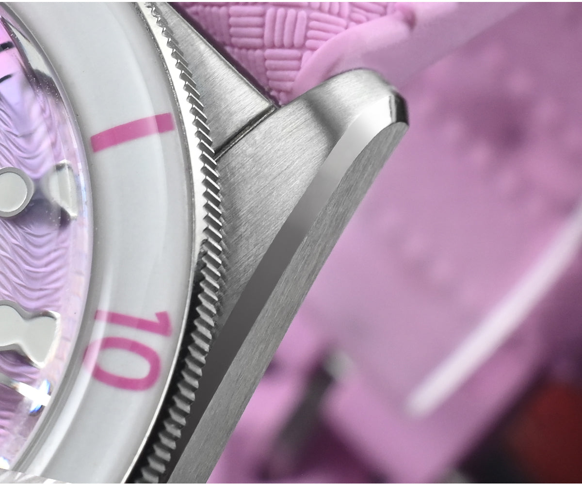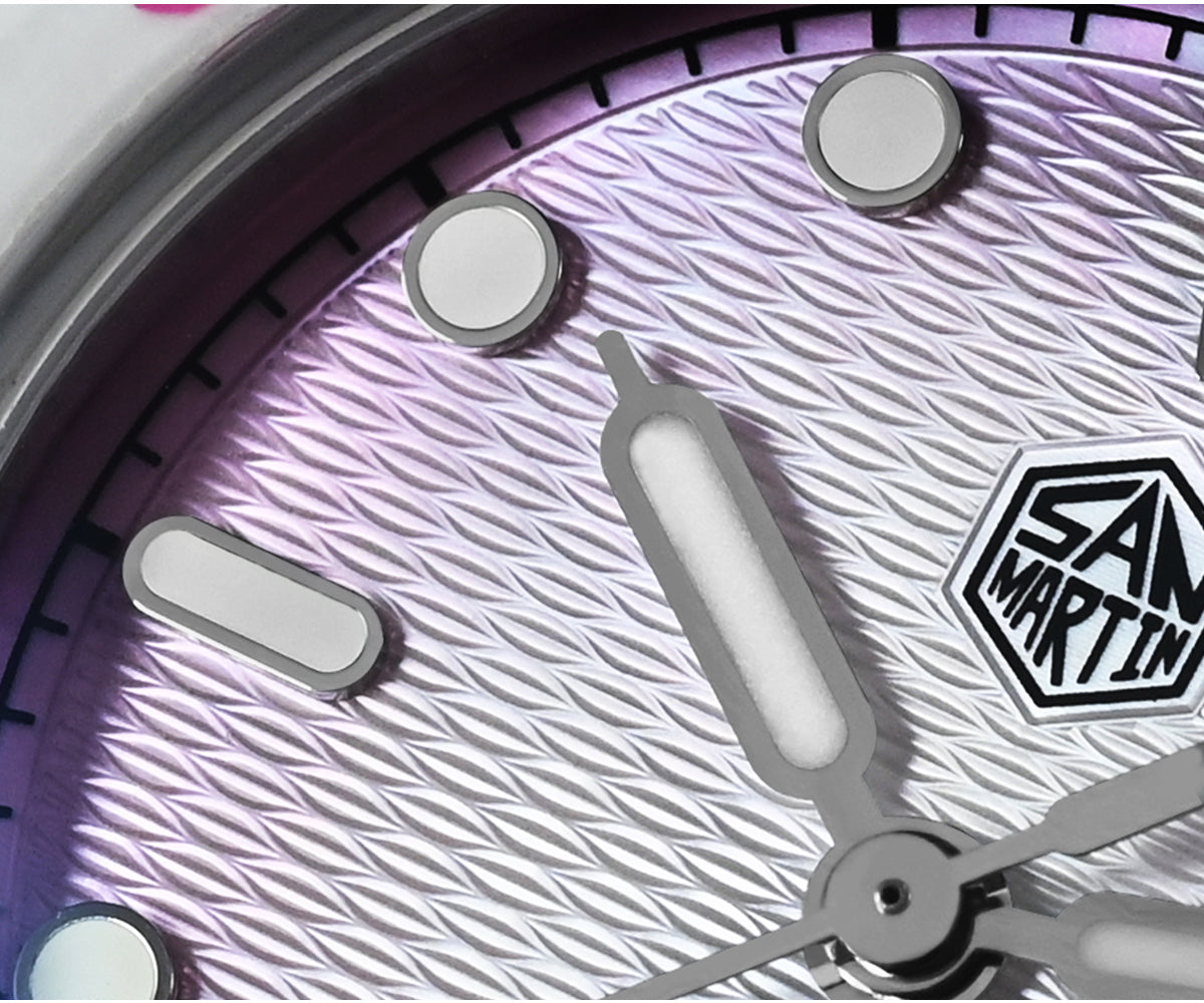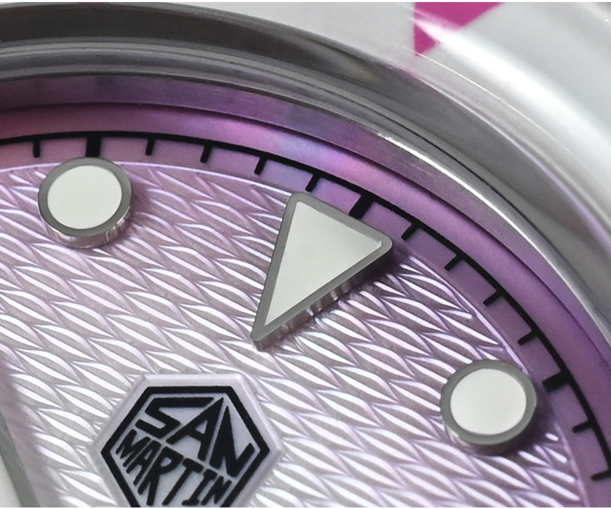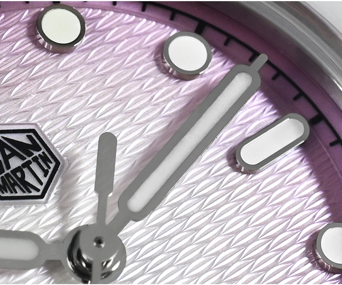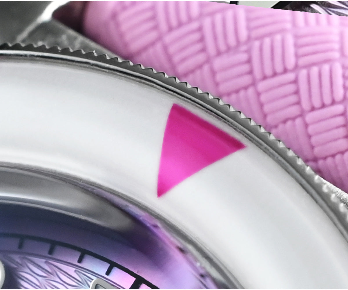 Dial Color: Light Blue/Pink/White MOP, Unique Guilloche Mother of Pearl Dial, Printed Hexagonal Logo & Applied Indice